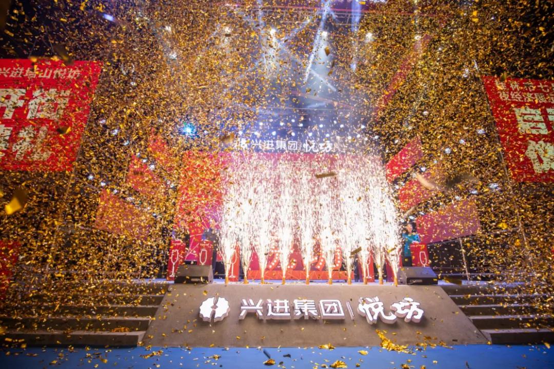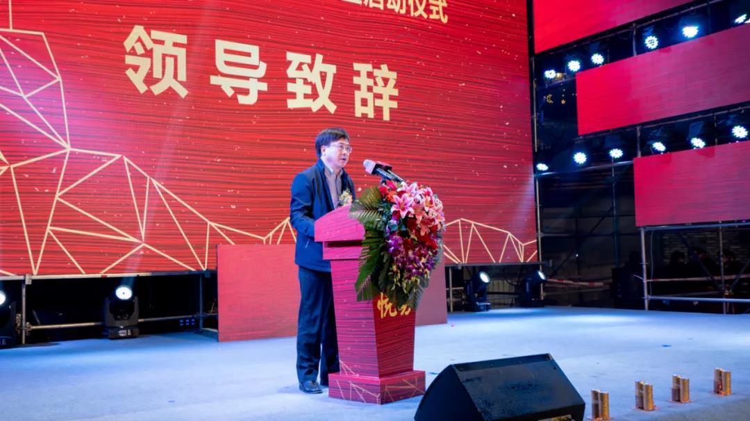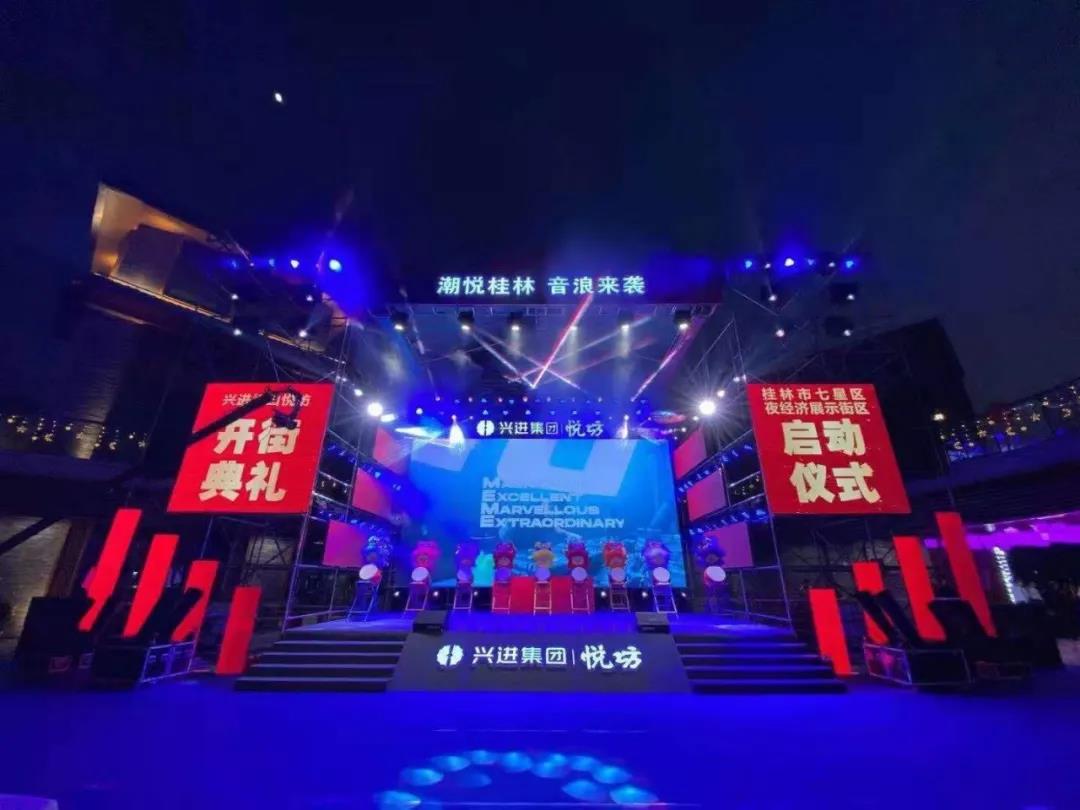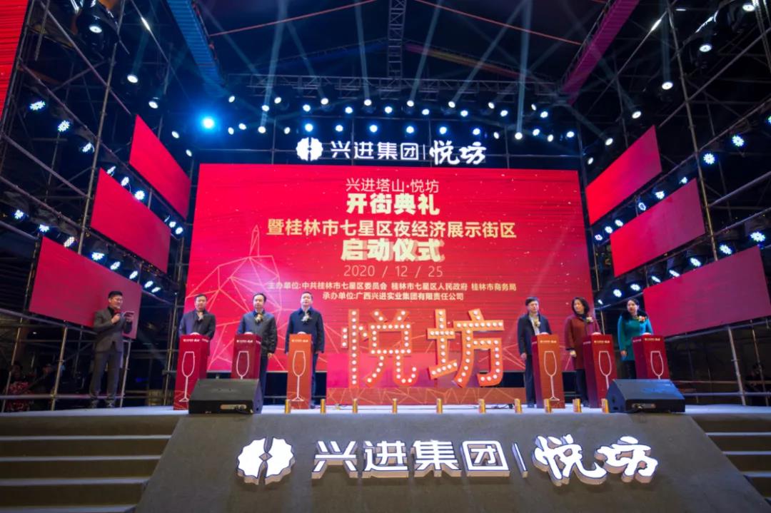 19時38分,啟動儀式正式開始。桂林市委常委、常務副市長彭代元,高新區管委會主任、七星區委書記石玉琳,七星區人民政府區長鄭平,桂林市商務局副局長呂佳軍,興進集團董事長羅欣,興進集團副總裁羅捷依次上臺。