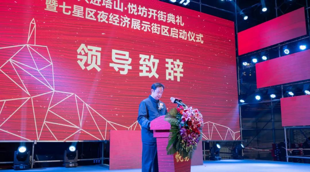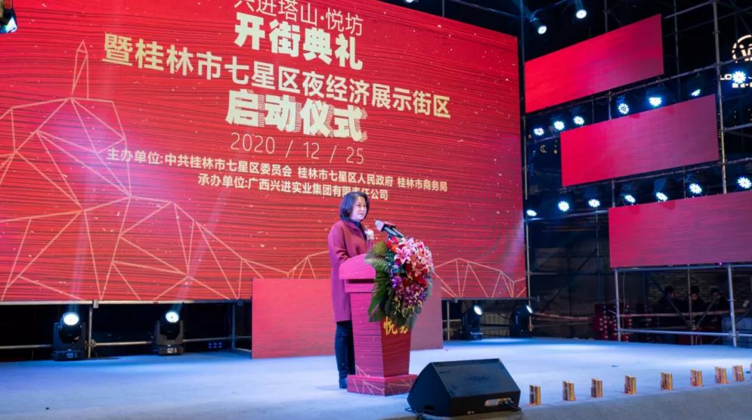 在現場熱烈氛圍下,七星區人民政府鄭平區長上臺擔任此次啟動儀式的嘉賓主持,她表示悅坊開街標志著塔山片區城中村?棚戶區改造項目建設再次取得新突破,也將對激活七星區夜間消費市場、助力桂林國際旅游勝地建設、填補區域文旅娛樂產業發展空白,產生重要影響。