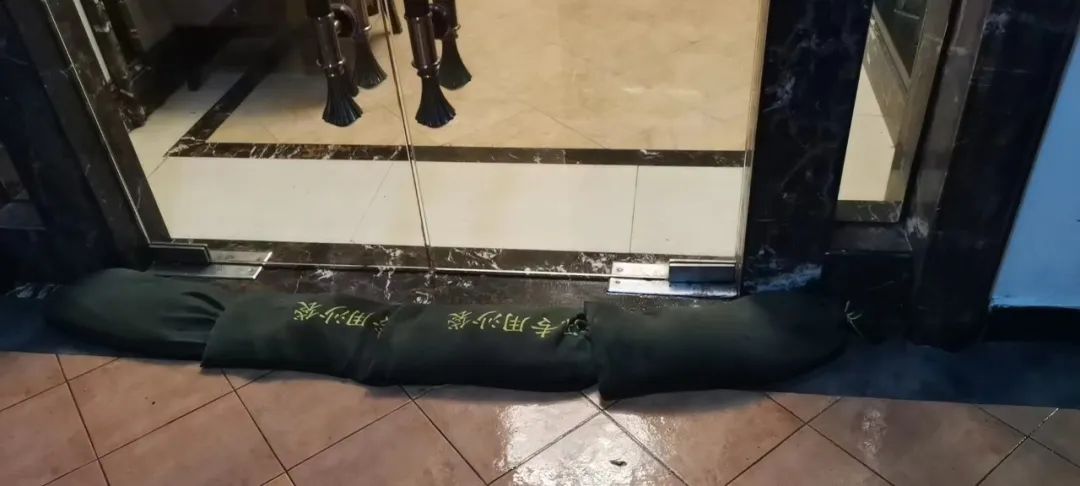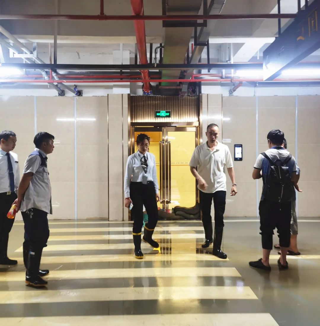 6月5日凌晨,興進·上譽物業人員緊急防洪排查工作,物業人員對各樓層進行水位查看、地下水泵使用情況巡檢,利用防洪沙袋、擋水板封堵的方式進行防洪。