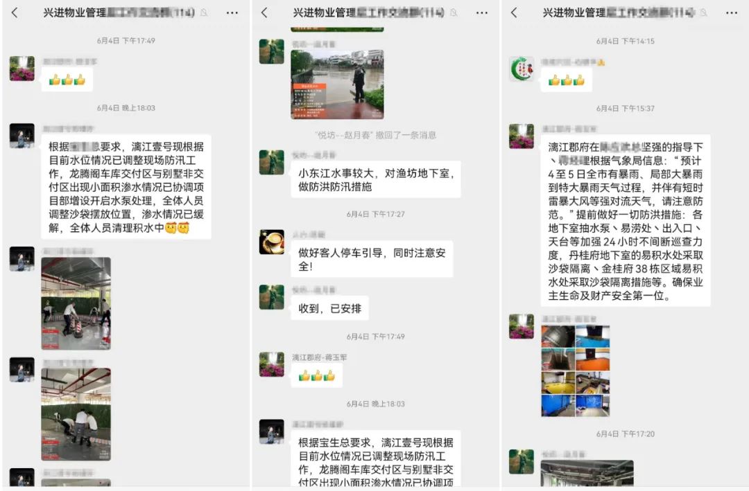 此次暴雨,集團領導班子高度重視,并到達現場指導工作。各項目負責人冒著雷暴天氣緊急趕往小區指揮處理防洪工作,并根據現場水位情況調整防洪措施。