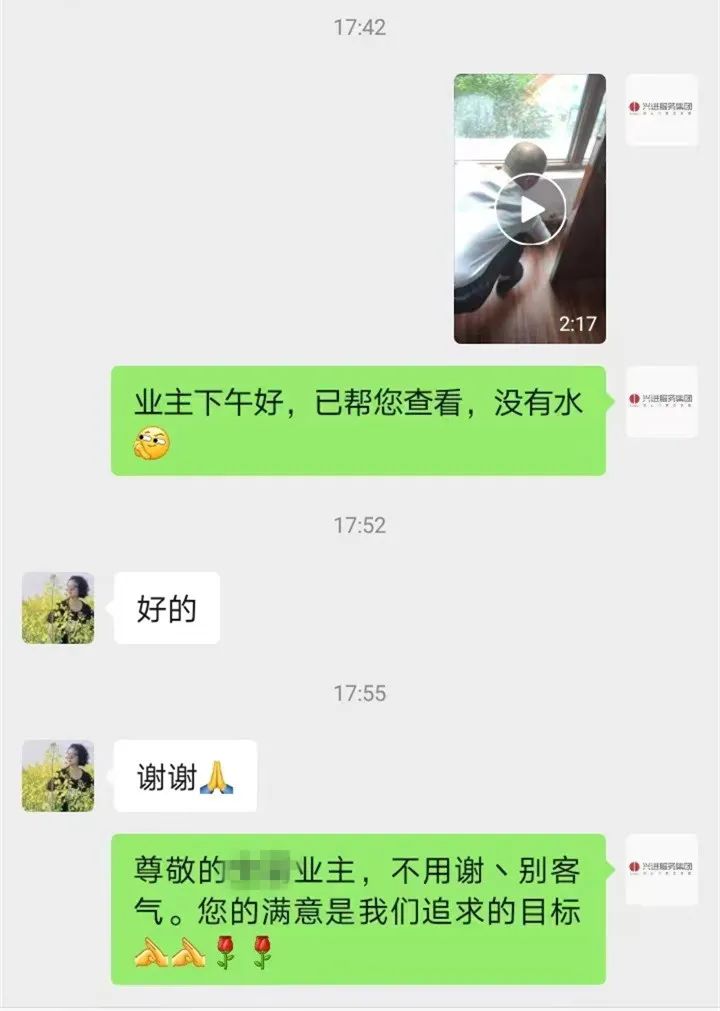 漓江郡府業主因去外地出差,特囑托物業管家照看。在暴雨來臨時,物業管家及時為業主檢查門窗是否關好,窗戶陽臺是否有飄雨等情況,并發送檢查視頻讓業主了解到家中的實時信息,業主非常安心和滿意。急業主之所急,想在前,行動為先,業主住的安心是興進物業的不懈追求。