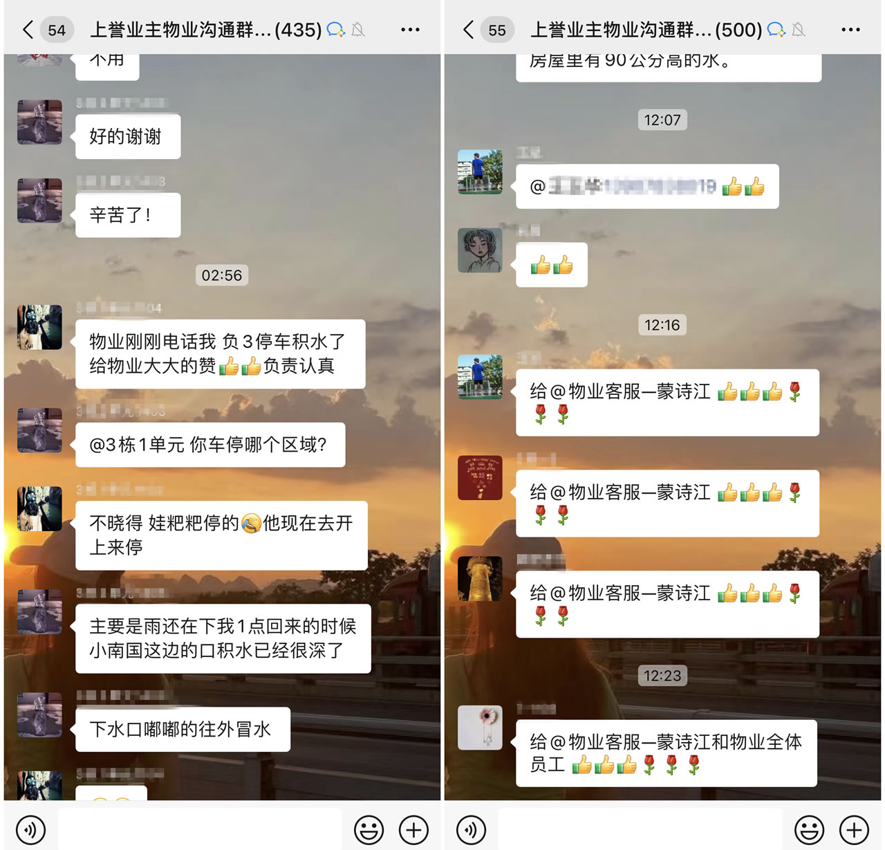 隨著雨勢越來越大,當部分洪水越過警戒線時,物業中心立即響應,客服管家第一時間通知車輛停放在停車場負3樓的業主,組織業主車輛停至小區高地,避免了業主車輛浸泡的風險。