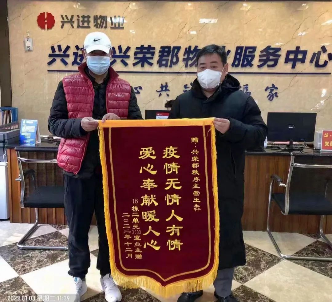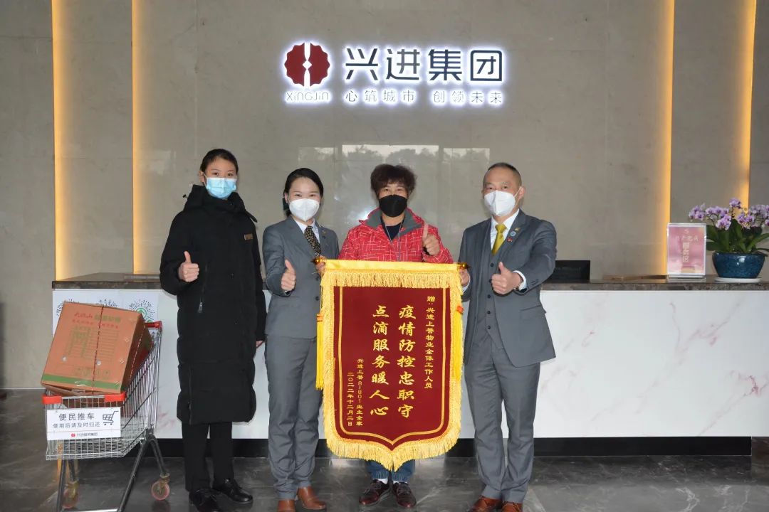 在2022年底,興進業(yè)主邵先生因為在外地工作,父母年紀大了,在家生病而無人照顧。接到業(yè)主求助后,興進物業(yè)王主管積極地幫助老人送物資送藥,像家人一樣照顧他的父母,邵先生工作結束回來后,看到興進物業(yè)人的盡心盡力的付出,十分感動,特意制作了一面錦旗表達感謝。
